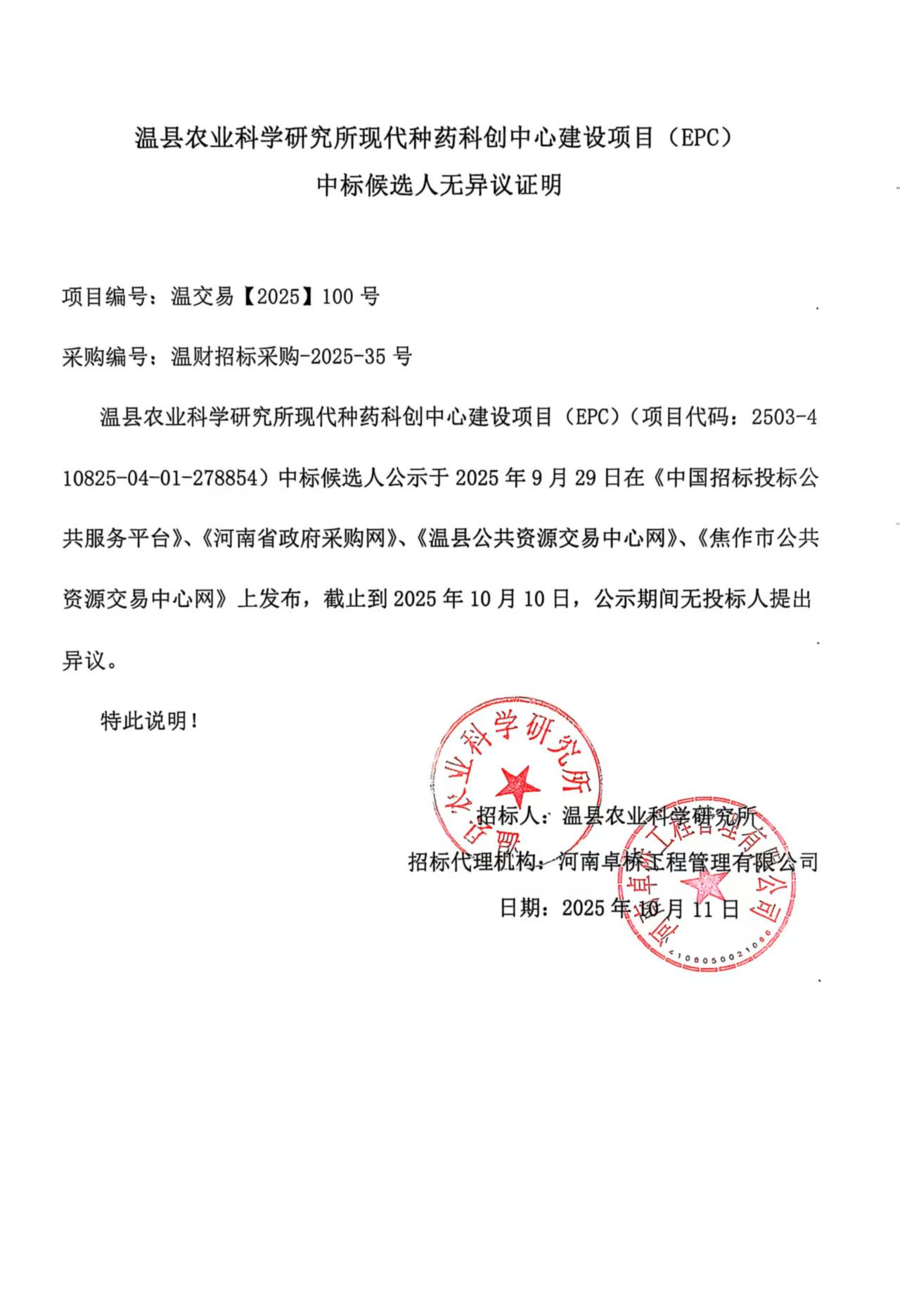 温县农业科(ke)學(xué)研究所現(xian)代(dai)种药科(ke)创中(zhong)心建(jian)設(shè)項(xiang)目(mu)(EPC)中(zhong)标结果公(gōng)告